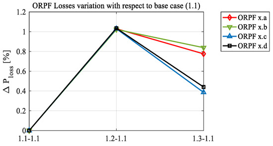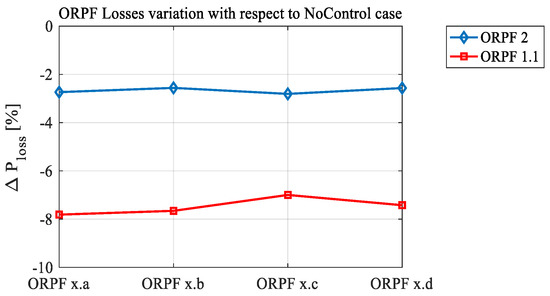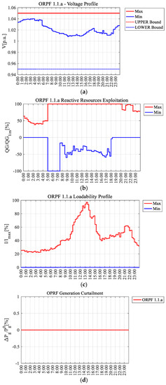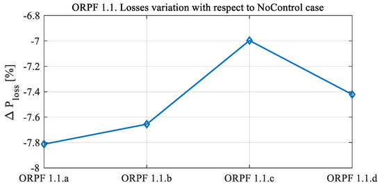 The specifications of the Centralized Control strategy proposed in this paper have been drawn following a thorough literature analysis (see the Introduction section), where the main drawbacks of the state-of-the-art approaches have been revealed. Centralized Control has been designed to mitigate these drawbacks. The numerical tests were not only aimed at emphasizing the raw performance of the algorithm (the minimization of the active power losses), but also at testing the validity of the adopted solutions. These tests were successful since (i) the resulting computation times were well contained, so the algorithm design choices will not cause numerical problems and the proposed strategy can be implemented in real DNs; (ii) the proposed OLTC model worked correctly, and the results showed major improvements in the performance of the algorithm when the OLTC control was used, showing the importance of OLTC representation in ORPF models for DNs; (iii) minimal active power curtailment actions were performed to solve branch congestions when strictly necessary; (iv) the interaction between the regulatory and physical capabilities of the DGs worked flawlessly. Moreover, the results clearly show that Centralized Control works properly from the point of view of its intended goal: the real power losses in the network are significantly reduced with respect to the initial conditions, while the constraints that act against the objective function’s minimization are reached. This means the real power losses are minimized, and the Centralized Control strategy is an ORPF.
