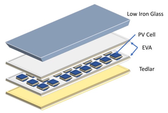 The active semiconductor layer is consisting of several photovoltaic cells interconnected in series and parallel depending on the required output current and voltage levels.The active layer is encapsulated between two layers of, as a most often used material, ethylene-vinyl acetate (EVA) to bind the PV cells to the top and bottom layers and provide moisture resistance and electrical insulation [,]. Fundamentally, the glass layer is tempered (to increase the mechanical strength of the module), highly transparent, low iron content and has a textured upper-surface (to reduce the solar irradiance reflection and absorption losses). The back layer is usually made of tedlar polymer that is functioning as irradiance blocker and also providing moisture resistance []. Anti-reflection coating (ARC) layer is typically added to the PV layer for efficient light trapping (not shown in Figure 1) []. The active semiconductor layer may consist of materials like mono-crystalline, polycrystalline or amorphous silicon.