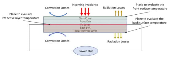 Each of the heat balance equation terms (including their different components) need to be modelled to estimate their values individually because their effects cannot be directly measured [,]. Such an analysis should be based on the instantaneous temperature of the PV module. Therefore, an iterative process is needed. Conduction (between the PV module layers), convection and radiation (from front and back surfaces) are the three main heat transfer mechanisms that have to be evaluated to calculate the amount of losses.