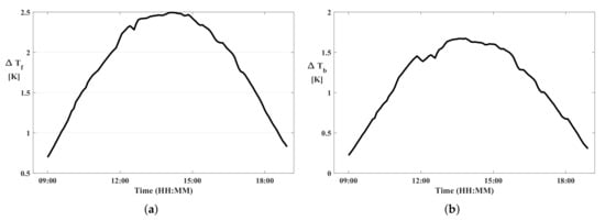 Convection is a heat transfer mechanism between the surfaces of the PV module and the surrounding air based on Newton’s law of cooling []. It is modelled by the corresponding heat transfer coefficients (). The amount of heat convection per unit area () is evaluated using the following equation: