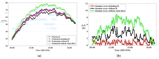 Some of these parameters are strongly influencing the module temperature; however, other parameters effect the thermal properties of the module only to a smaller extent []. For example, the module temperature is highly sensitive to the wind speed and much less to the wind direction [,]. Some of these parameters are not easy to be included in a general approach for estimating the module temperature since the module thermal behaviour is changing for different technologies [].