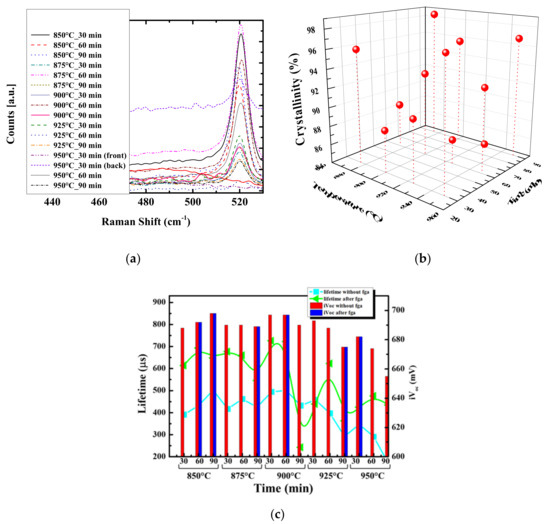 (a) Raman spectroscopy; (b) change in crystallinity of the a-Si:H thin film after thermal annealing; (c) change in the passivation property as a function of the heating temperatures for three different process times.