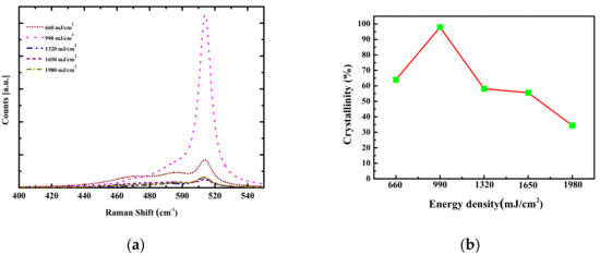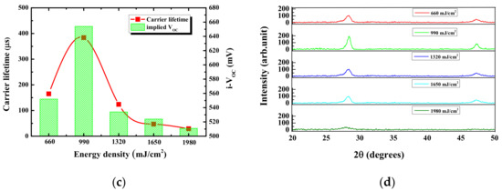 Details regarding the a-Si layer crystallization and the evaluation of the passivation property are described in this subsection. As discussed previously, ELA using the deep UV laser was conducted at a laser energy density of 660–1980 mJ/cm2 with a fixed scan speed of 5 mm/s. The crystallinity and passivation property of the crystallized poly-Si were observed and analyzed. Figure 2a shows the Raman spectra with the increase in laser energy density. As the laser energy density increased, the a-Si peak intensity decreased and the poly-Si peak increased up to 990 mJ/cm2 energy density. The degree of poly-crystallization and grain growth was clearly observable. The Raman spectra showed that the peak appeared around 515 cm−1, confirming crystallization of poly-Si. The peak intensity reached a maximum at 990 mJ/cm2. However, further increase in laser energy density resulted in a drastic fall in the peak of poly-Si in Raman shift, indicating the agglomeration of poly-Si. Figure 2b indicates the degree of crystallinity initially increases with an increase in the laser energy density; however, it began to decrease beyond a certain threshold of the energy density. An energy density exceeding 990 mJ/cm2 resulted in damage to the poly-Si membrane, thereby breaking the lattice structure. The crystallinity also impacted the crystal size, as shown below. Laser energy density also influenced the passivation property of the crystallized a-Si layer. Figure 2c indicates that τeff and i-VOC significantly increased when the laser energy density increased from 660 to 990 mJ/cm2; on increasing the energy density further, τeff and i-VOC decreased considerably. The passivation property was highest when τeff and i-VOC were 384 µs and 654 mV, respectively, with a crystallinity of approximately 98%. Figure 2d shows the XRD analysis of the samples subjected to deep UV ELA with different laser energy densities. The highest peak intensity was observed from this figure at 990 mJ/cm2, with a laser energy density around 2θ = 28.39, corresponding to Si (111). The figure shows the increase in laser energy density resulted in the decrease in peak intensity, corresponding to Si (111), indicating the degradation in crystallinity. The crystalline size was calculated by the Scherrer equation [29]: