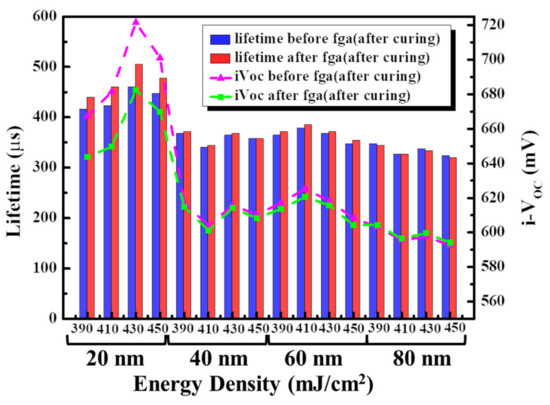 During the crystallization of a-Si using the XeCl excimer laser, the energy density was varied from 390 to 450 mJ/cm2, with a varied a-Si layer thickness of 20–80 nm. The samples were cured at 900 °C for 60 min to achieve higher oxidation and better passivation. Figure 4 presents the passivation property observed under these conditions. This figure indicates that the oxidation during ELA increased as the a-Si layer thickness decreased and the laser energy density increased; this occurred because the optical penetration depth for ELA is shorter, making it difficult to crystallize thick a-Si layers. When the laser energy density exceeded 430 mJ/cm2, the passivation property decreased due to damage to the a-Si layer.