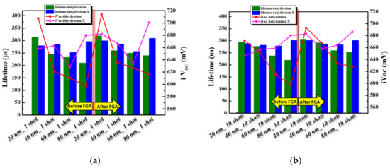 The crystallization of a-Si:H using KrF excimer laser was performed. The laser energy density was kept constant at 140 mJ/cm2 while varying the laser shot count from 1 to 10 for a-Si layer thicknesses of 20–80 nm. The samples were subjected to curing at 900 °C prior to ELA, and FGA was conducted subsequently. This significantly improved passivation. Figure 5a,b indicate the variation in the passivation property as a function of the a-Si layer thickness for laser shot counts of 1 to 10. This figure shows that the passivation property increased with the laser shot count in the case of a thin a-Si:H layer; however, an increase in the thickness of the a-Si layer significantly reduced the passivation property. Highest τeff and i-VOC values of 353 µs and 674 mV, respectively, were obtained after the FGA process as shown in Figure 5a. However, the experimental results also indicated that the ELA process conditions need to be further optimized to reduce manufacturing costs and enable the large-scale application of this technique for efficient production.