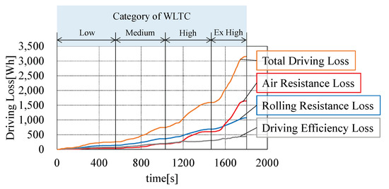 The air resistance accounts for 52.1% of the total loss. The rolling resistance is 37.9%, and the driving efficiency loss is 18.8% of the total loss. Vehicle mass is only one parameter that affects both the rolling resistance and driving efficiency, and the total is approximately half of the driving loss. Especially, without the extra high-speed mode, which is one of the categories of Worldwide harmonized Light duty Test Cycle (WLTC) which is regulated in WLTP, the rolling resistance loss and driving efficiency loss are 62.1% of the total loss. Though the vehicle speed extra high mode is more than 120 km/h, there is only 80 km of highway where the speed limit is 120 km/h in Japan. Thus, weight reduction is the most effective way to decrease energy requirements.