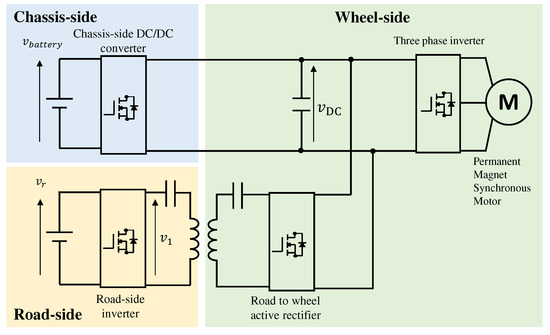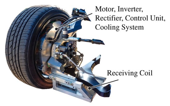 We have developed a novel driving system named the wireless in-wheel motor (WIWM). It integrates the driving system and dynamic charging system, which include motor, inverter, rectifier, control unit, cooling system, and receiving coil in the unsprung area. The latest one, named the third generation of wireless in-wheel motor (WIWM-3), is shown in Figure 2.