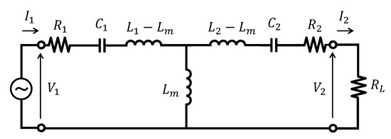 WIWM adopts magnetic resonance coupling, and thus, minimizing the air gap is effective in improving the WPT efficiency. Moreover, the air gap affects parametric optimization to maximize the efficiency of the system, and the constant air gap is suitable for efficient control. This DWPT system has a series–series (SS) type WPT system. SS type can realize high efficiency with robust control [22]. The equivalent circuit of SS type WPT system is displayed in Figure 3. The equivalent load when WPT system transmits with maximum efficiency is described as below: