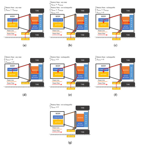 DWPT state of IWM-3. (a) Driving with Energy of Battery and WPT; (b) driving with only energy of WPT; (c) driving and charging with energy of WPT; (d) driving with energy of the battery; (e) charging with energy of regenerating and WPT; (f) charging with energy of WPT; (g) not driving or charging.