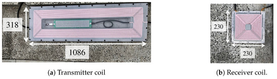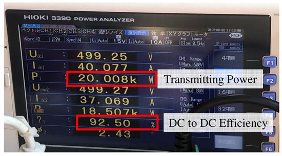 In this study, the parameters of the WPT system are based on WIWM-3. The specification of the WTP system is shown in Table 2. is the voltage of battery output. These parameters are the measured values set at a nominal position of 85 kHz, which is in the regulated frequency range of SAE J2954. SAE J2954 is a standard of stationary WPT system for electric vehicles. Coil size consists of the wire, coil case, and ferrite blocks. The transmitter coil and receiver coil are displayed in Figure 6. The maximum voltage of the resonant capacitor of the transmitter side will be 7 kV, then the board of resonance capacitors is set into the center of the coil to decrease line voltage outside of the transmitter coil case. Charging energy of DWPT is decided by the WPT power, vehicle speed, and the receivable area. Then the transmitter coil is bigger than the receiver coil due to the increase in the received energy. The effective voltage of WPT in the form of a rectangular wave, and the minimum is the fundamental wave of the battery DC voltage . Transmit efficiency is evaluated in the WPT bench displayed in Figure 7. The output of AC/DC converter which is supplied AC voltage from the distribution board is connected to both transmitter side and receiver side. Then, and are the same during evaluation and are not optimized to maximum efficiency. The inverter of the transmitter consists of an SiC power device due to high-frequency switching. The specification of SiC power device of the transmitter is in Table 3 [23]. The rectifier can be used for synchronous rectification. The test result at 85 kHz is shown in Figure 8. DC Voltage supply is 499.3 V, and thus, and are in the range of the specification. DC-to-DC efficiency which includes the inverter loss, copper loss, iron loss, and rectifier loss reached 92.5% with 20 kW output.