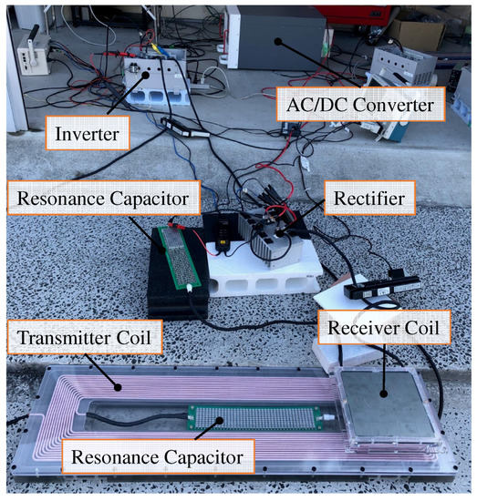 However, the conventional electromagnetic induction WPT is not efficient with large coil gaps or misalignment between the transmitting coil and the receiving coil, and it is suitable only for stationary applications. To solve these problems, WPT with magnetic resonance coupling was proposed in 2007 [6]. Therefore, some DWPT projects for passenger vehicles adopt magnetic resonance coupling for DWPT systems [7,8,9,10,11,12]. A DWPT system that may be adopted for both passenger vehicles and trucks [13] has been proposed. Moreover, DWPT is also studied as a potential charging system for some transportation applications, which are a transportation robot [14], a train [15], or a garbage collection truck [16]. Not only the system, but also the control [17] or circuit topologies [18], have been actively researched. A DWPT system with capacitive coupling, [19,20] has been also proposed. Capacitive coupling uses the capacitance between the transmitter and receiver. The strong point of capacitive coupling is its high efficiency and simple structure. However, when it is raining, and water penetrates between the transmitter and receiver, electric field coupling cannot be used easily due to a change in capacitance between the transmitting side and the receiving side. Therefore, the DWPT system with electric field coupling cannot be used on public roads. Stationary charging may, however, lead to another problem. For example, while autonomous vehicles do not require humans to drive, human intervention is still necessary to charge the vehicles. Naturally, the next step would be to eliminate human intervention.