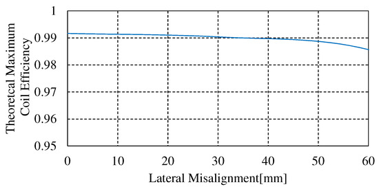 Here, k is the coupling factor, and Q is the quality factor of the coils. The result of theoretical maximum efficiency change by misalignment is displayed in Figure 9. With 60 mm lateral misalignment, there is 0.6% reduction of theoretical efficiency.
