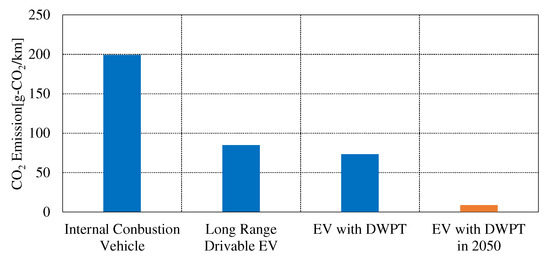 Then, the simulation result of CO emission with the values in Table 4, Table 5 and Table 6 is shown in Figure 10. The long-range drivable electric vehicle can reduce CO emission of the internal combustion vehicle by 57.4%. Moreover, the lightweight electric vehicle with the DWPT system can reduce CO emission of the internal combustion vehicle by 63.1%. Thus, the long-range drivable electric vehicle will emit 16% more than the electric vehicle with DWPT. In 2050, the Japanese target for CO emission reduction during generation is to 12% of the values in 2019 [28]. Therefore, DWPT has the potential to decrease CO emission in an internal combustion vehicle by 95% in 2050.