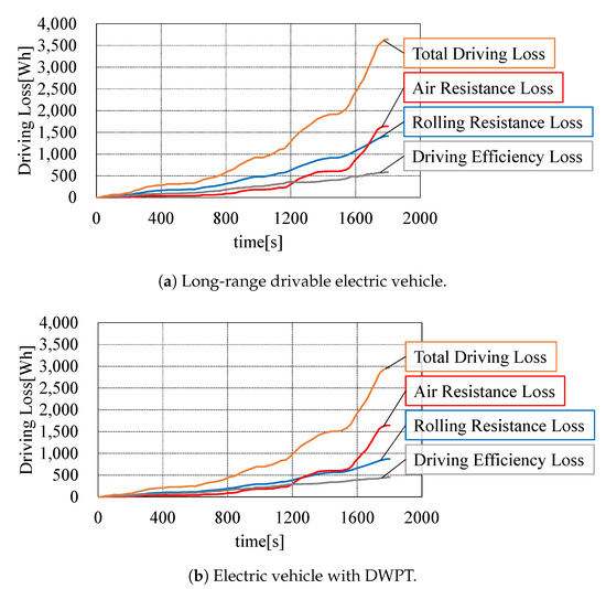 The loss of the long-range drivable electric vehicle and the electric vehicle with DWPT is also analyzed. The result of the loss analysis is displayed in Figure 11. The air resistance loss is not changed, because the vehicle mass does not affect the air resistance. The rolling resistance loss of the electric vehicle with DWPT decreases by 38% compared with the long-range drivable electric vehicle. Moreover, the driving efficiency loss of the electric vehicle with DWPT also decreases to 22% of the long-range drivable electric vehicle. The basic loss is 7.5% of charging energy due to 92.5% WPT efficiency.