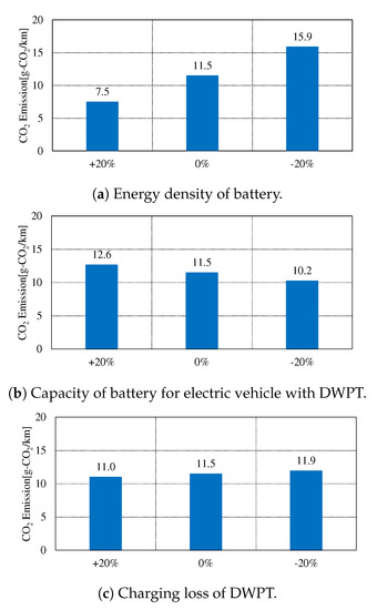 The sensitivity of the parameters is also analyzed. Some parameters adopt estimated values or are based on one study. Hence, there is uncertainty in the assumptions adopted for simulation remain. Therefore analyzed parameters relate the strong point of the DWPT system. A strong point of DWPT is the reduction for the mass of batteries. Then, the analyzed parameters which have relation for the mass of battery are energy density of the battery, the capacity of battery loading the electric vehicle with DWPT. Charging loss of DWPT is also analyzed. Each sensitivity analysis is with ±20% parameter change. The evaluation function is the difference of CO emission between the long-range drivable electric vehicle and the electric vehicle with DWPT.