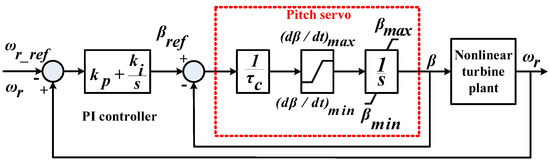 Figure 2 illustrates a typical pitch control system, including the PI controller, pitch servo, and a nonlinear turbine model [20]. The pitch servo system consists of the actuator and motor shown in Figure 1d. The pitch actuator is a nonlinear servo that generally rotates all of the blades or a part of them. In the closed loop, the pitch servo can be modeled as an integrator or a first-order delay system with a time constant . Equation (12) provides the dynamic behavior of this system [20]: