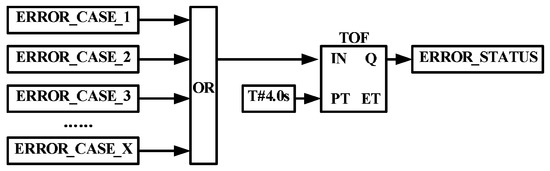 Many fault indicators are defined in the WT controller to reflect the operating status of the WT. Any high-level output from the indicators triggers the fault status, and the WT controller switches fast or emergent mode. The logic is shown in Figure 4. In particular, a turn-off delayer (TOF) is added after the OR logic operation, which contributes to maintaining the input of the TOF for 4 s. The sampling period in the WT controller is 20 ms. A total time of 4 s or 200 periods aims to ensure that there is sufficient time for communication, signal processing, and device action when the OR logic operation outputs a high level.