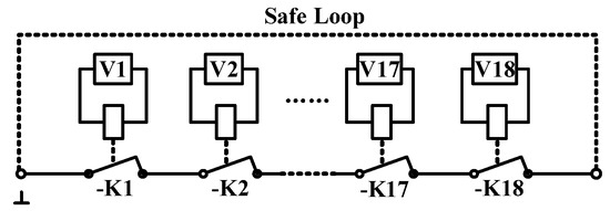 Different from other fault indicators, the 18 error variables shown in Table 2 indicate that the WT has been operated in an emergency and must be stopped and checked as soon as possible. As shown in Figure 5, the variables (from V1 to V18) control the nodes (from K1 to K18) of a safe loop. Any output variation of the variables indicates the breakup of a node, which would lead to an interruption of the loop and the emergent mode in the WT controller. The threshold values of the variables are shown in Table 3.