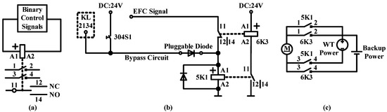 The LVRT control circuit is shown in Figure 6. Figure 6a introduces the control structure of a DC contactor. Contacts 1–4 are the main contacts. Contacts 11, 12, and 14 are auxiliary contacts. Contact 11 is a common port. Contact 12 is a normally closed (NC) contact. Contact 14 is a normally open (NO) contact. When Coils A1 and A2 operate, Contacts 1–4, 11, and 14 are synchronized to operate. Contact 12 executes a reverse action. Elements 6K3 and 5K1 in Figure 6b are DC contactors. 304S1 is a manual switch. Module KL2134 is a 4-channel digital output terminal for electrical isolation, which provides binary control signals [34]. KL2134 will output a high level when a combination of the following conditions is true. (1) The pitch angle reaches 91°. (2) The pitch actuator is fault-free. (3) The WT controller outputs a reset command. KL2134 and 304S1 together provide a bypass circuit. Figure 6c is the power-switching circuit of the pitch actuator (including the servo motor).