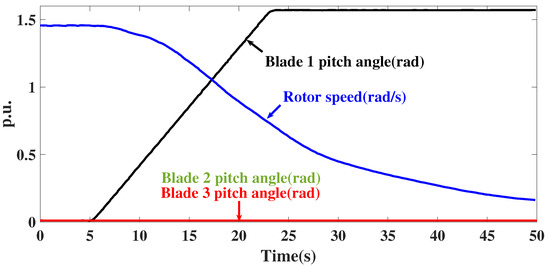 Simulation results of the extreme case of the WT in an accident. The p.u. values of the pitch angle and rotor speed are 58.20° and 9.3 rad/s, respectively.