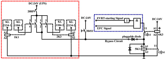 The control circuit in Figure 6b is redesigned for the bypass circuit and the (signal) input part. As shown in the red box in Figure 9, DC contactors 1K1 and 2k3 are added in the bypass circuit, and their structures are shown in Figure 6a. Contacts 1–4 are the main contacts of 1K1. Module KL1104 is a 4-channel digital input terminal for electrical isolation, which detects the input level periodically as a monitor [35]. The conditions of KL2134-1 outputting a high level are identical with those of KL2134 in Figure 6b. However, the condition of KL2134-2 outputting a high level is that the WT controller provides a ZVRT-ending command. 208F9 is an air switch to isolate the UPS from the contacts.