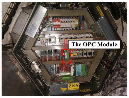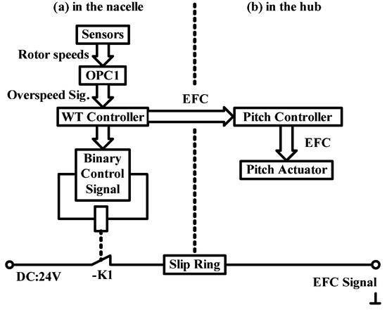 The existing OPC scheme is shown in Figure 10. Sensors are installed in different locations in the nacelle and measure different types of rotor speeds, such as the shaft speed and the rotor speed in the generator. The OPC1 module is installed in the WT controller cabinet and receives the rotor speed data from the sensors. If any rotor speed is beyond the threshold value, the OPC1 module will send an overspeed signal to the WT controller. Then, the WT controller will interrupt the safe loop and output an EFC to the pitch controller. The EFC signal will output a low level to enable the backup power (explained in Figure 6) because the NC contact K1 turns to open. However, the OPC devices in the existing scheme are far away from the pitch system in the structure, which produces a substantial amount of long-distance signal transmission. Section 4.2.2 and Appendix B confirm that there may be some failures in the long-distance signal transmission, which will eventually lead to not-pitching failures. Furthermore, in the control logic during a ZVRT, the pitch system will pitch by the fast-feathering method in the first 1000 ms. If the ZV dip is exactly a power-loss situation, the pitch system might lose communication and power supply after 1000 ms, resulting in an overspeed risk.