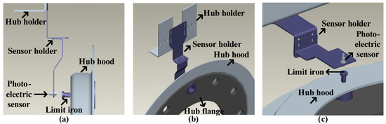 Physical structure of the variable-speed pitch system: (a) side view of the hub; (b) front view of the hub; (c) perspective view of the hub; (d) schematic diagram of a pitch system.