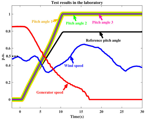 Test results in the laboratory. The p.u. values of the pitch angle, generator speed and wind speed are 91°, 1750 rpm and 11 m/s, respectively.