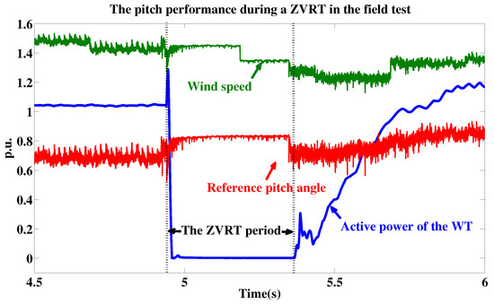 Finally, an operating WT in Hebei, China, is transformed with the holistic control scheme, and then a field test of ZVRT is conducted according to the test method suggested by IEC [30] (the ZV conditions are simulated according to Figure 19). The ride-through period is defined as 430 ms according to the South Australian standard [32], which is the strictest in the world [12]. The active power of the WT shown in Figure 20 indicates that the WT has ridden through a ZV dip successfully and not triggered the emergent mode during ZVRT. The pitch angle in Figure 20 verifies that the pitch system does execute a feather command at the start of the ZV dip and a fine command at the end of the ZV dip successfully according to the control logic in Section 4.1.