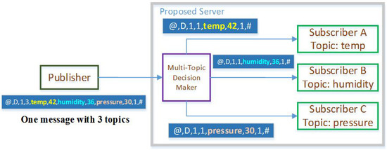 The approach shown in Figure 3 is the multi-messages technique; however, in our proposal, we consider multi-topic messaging rather than multi-messaging. In our proposed multi-topic messaging protocol, we can send a single message with many topics; for example, as shown in Figure 4, three topics (i.e., temperature, humidity and pressure) are all sent in one message by the publisher to the broker. Then, the broker (proposed server) can detect and split this message into the number of new messages (three messages according to the three inherent topics in the received one) and resend each topic in a message to its specific client (each subscriber) without delay and loss in the data. The system acts intelligently as if it had received three separate messages from the publisher although it received one.