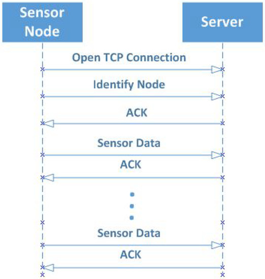 The sensor node opens a TCP connection by sending a “connect” message to the broker server, as shown in Figure 6. This node must also send an identification number (ID) to the broker server to identify this node on the system. Then, it waits for an acknowledgment message (ACK) from the server; after that, it will be ready to publish the sensing data (either periodic or at interrupt times) or the information to the broker.