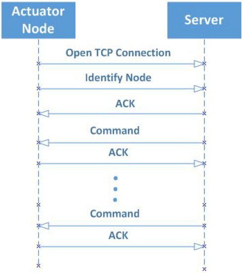 The actuator node and the main server first open a TCP connection. Then, the identification process is performed. Afterwards, this node will receive commands or messages which are transmitted by the monitor nodes (i.e., monitor clients) through the main server, as shown in Figure 7.