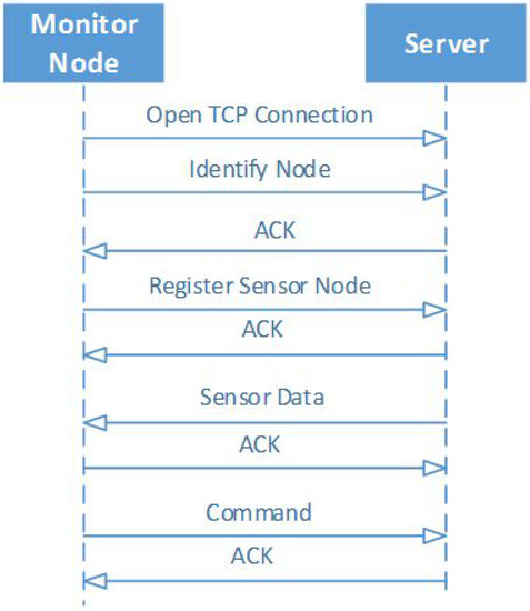 The monitor node opens a TCP connection with the server after the identification process is performed; it registers to receive data from certain sensor nodes and then sends its messages to a specific actuator via the broker server, as shown in Figure 9.
