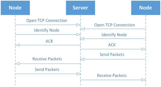 All node to node (client to client) communications must be done through the broker. Each client/node will try to establish a TCP connection and identify itself with the server. Then, it waits for an ACK message back from the server. After receiving the ACK message, successful communications between clients or nodes through the broker server can be done by sending and receiving different communication packets, as shown in Figure 10.
