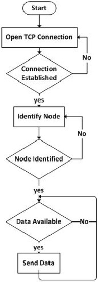 A normal node performs the functionality of actuator and sensor nodes: it opens the TCP connection, then it identifies itself to the server with an identification number. Afterwards, it sends the sensed data to the server, and any actions or commands received from the server by the monitoring notes will be also executed through this node, as indicated in Figure 8.