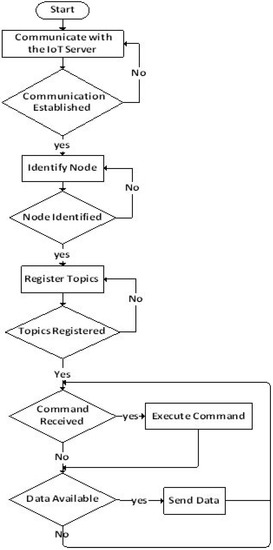 Communication Nodes: The server (broker), which is topic-based, is responsible for connecting nodes (client/devices). The different IoT nodes communicate with others through the server to accomplish the functionality of the system. A sequence diagram that describes each node type is shown in the next sections.