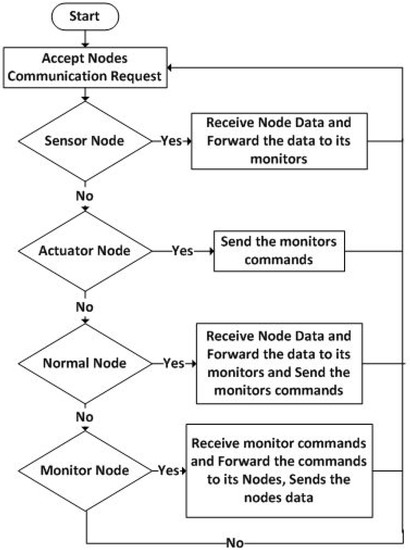 If the sensor node is connected to the server, it forwards messages to the monitor node (registered node); if the connected node is an actuator node, the server will send the monitor message commands to it; if it is a normal node, the server will do the same thing for the actuator and sensor nodes; and if it is a monitoring node, it sends commands (messages) to the server and then forwards them to the actuator node.