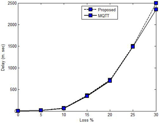 MQTT versus proposed protocol average end-to-end delay in seconds for different rates of losses (%).