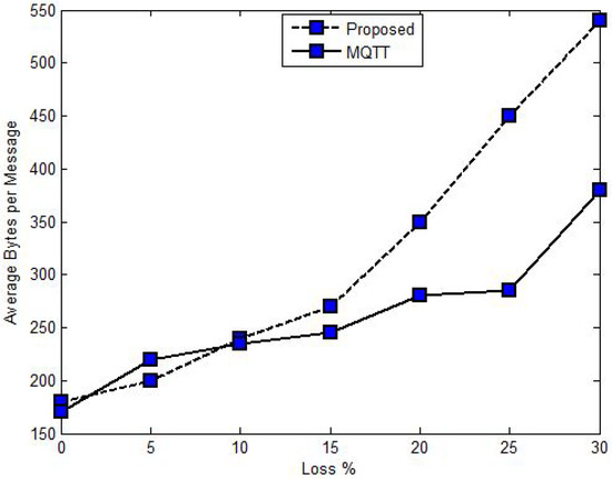 In Figure 24, the average message bytes of MQTT and the proposed protocol are close when the network losses are less than or equal to 10%. After that, the message bytes of the proposed protocol are greater than MQTT. When the network losses increase, the difference between the protocols increases. Here, a lower protocol overhead is introduced by a single-topic message, but a small increase is found for the multi-topic message. The new frame headers that are added to achieve the multi-topic functionality are the reason for this behavior.