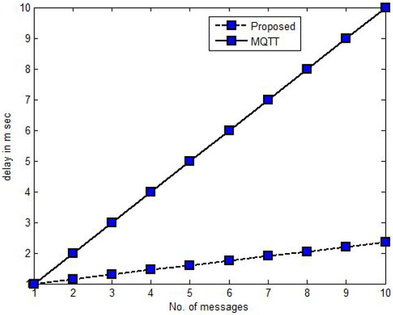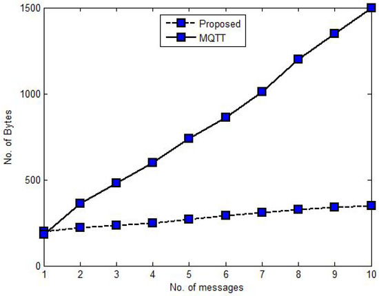 In Figure 25 and Figure 26, when the number of the transmitted messages is equal to one, MQTT and the proposed protocol have approximately the same message delay and message size. However, when the number of transmitted messages is equal to two, the introduced message delay and message size from the MQTT are larger than the proposed approach. This difference increases as the number of transmitted messages increases. These observations and results arise because sending multiple single-topic messages adds more overhead than sending one multi-topic message, as MQTT requires a number of messages to be sent that equal the number of topics (one message per topic). On the other hand, the proposed protocol sends only one multi-topic message that has a lower overhead and achieves more throughput than the single-topic messages.