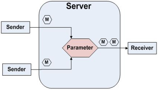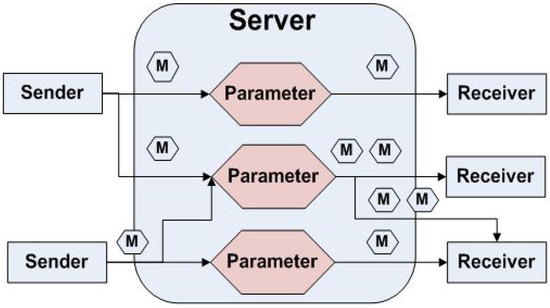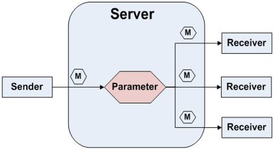Figure 27. Data decoupling.One-to-many messaging is the second feature of the pub/sub systems shared by the proposed protocol, which means that a node can send the same message to many nodes at once. The sender node will send a message with a specific parameter name to the main server, and the server will send the same message to all the registered nodes with the same parameter name, as shown in Figure 28.