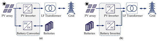 System diagram of the single-stage 1500 V PV system with integrated battery energy storage systems (LF: low-frequency transformer): (a) DC-coupled configuration and (b) AC-coupled configuration.
