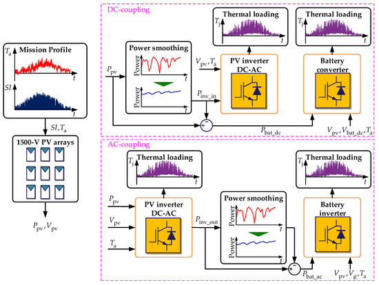 In this paper, a single-stage 1500 V PV system is considered, as shown in Figure 1, where a BESS is deployed under the DC- or AC-coupled configuration for power smoothing. The reliability analysis that is given in this paper focuses on the power semiconductor devices. The power flow of the system can then be modeled, as shown in Figure 2, where and are mission profile parameters, i.e., the ambient temperature and the solar irradiance, respectively; and respectively denote the power and voltage of the PV arrays; and represent the input and output power of the PV inverters; and are the input power of the battery converter and the battery inverter; , , and represent the grid voltage, the battery voltage for the DC coupling, and the battery voltage for the AC coupling, correspondingly; and, is the junction temperature of the power devices. The overall inputs are the mission profiles of the installation site that represent the system operating conditions [20] and the outputs are the thermal stress profiles of the power semiconductors in PV/battery converters for the next reliability analysis, as it can be observed in Figure 2. A description of each model for this mission profile translation is given in the following sections.