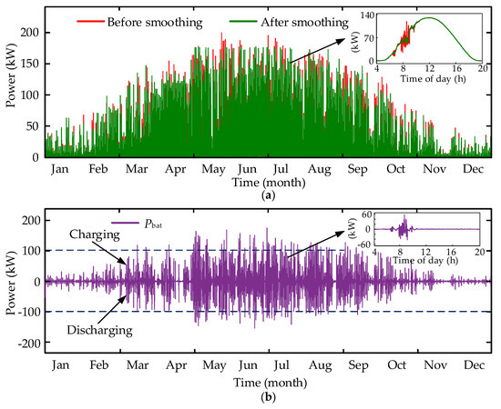 Power smoothing analysis: (a) input power of the PV inverter with and without power smoothing and (b) power reference for the DC-coupled BESS.