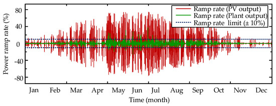 One-year power ramp-rate analysis: the ramp rate of PV output and the ramp rate of PV-BESS (plant) output when energy storage system is deployed for power smoothing.