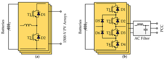 For 1500 V PV applications, several studies have shown that single-stage conversion PV systems (without DC-DC stage) outperform two-stage based PV systems with respect to size, efficiency, and cost-effectiveness [7,8,9]. For the same reason, the battery energy storage systems (BESS) for large-scale PV Plants are also based on single-stage conversion [10,11], i.e., one bi-directional DC-DC or DC-AC stage depending on the type of connection: DC-coupling or AC coupling. As illustrated in Figure 1a, in DC-coupling, the output of the BESS is connected to the DC side of the PV inverter, while, in AC-coupling, as shown in Figure 1b, the BESS is added to the PV system at its AC side. Both of the configurations have the potential to improve the grid-integration performance of 1500 V PV systems. Flexible power management is significantly enhanced in such systems.