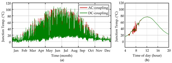 Junction temperature of the IGBT T1 (see Figure 4) in the PV inverter integrated with the AC- or DC-coupled BESS: (a) one-year operation and (b) one-day operation.