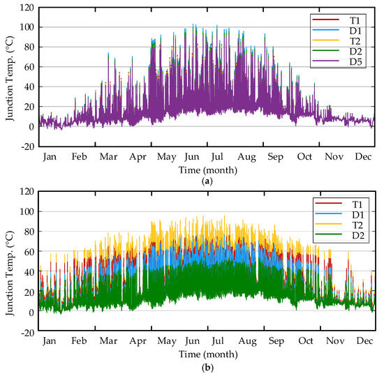 Figure 8 presents the resultant junction temperature of the IGBT T1 (see Figure 4) in the PV inverter integrated with the AC- or DC-coupled BESS. It can be seen in Figure 8 that the DC-coupled BESS can considerably reduce the thermal stress of the IGBT T1 during the power smoothing process. This is also true for the remaining devices (e.g., IGBT T2, diode D1, D2, and D5), which is not presented here, as their temperature profiles are similar to the presented one, and they will be considered in the lifetime and reliability analysis in the following sections. Figure 9 shows the temperature profiles of the power devices within the AC- and DC-coupled BESS converters. The power devices in the battery inverter have a similar temperature profile, as shown in Figure 9a, while they present a significant difference, as shown in Figure 9b, for the battery converter. The variety of these temperature profiles will cause cyclic thermo-mechanical stresses among the different materials inside the power devices, which finally lead to cumulative bond-wire and solder-joint fatigue after a certain number of cycles. The evaluation of the damage will be discussed in the next section. Nevertheless, as seen from the translated thermal loading profiles on the power converters, the coupling configurations will affect the reliability performance of the power converters and, thus, the entire PV-battery system.