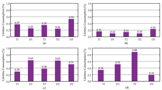 Applying the above calculation, the one-year of all the IGBTs and diodes in the PV-battery systems can be obtained. Figure 10 summarizes the results. For the PV inverters, as expected, the DC-coupled configuration alleviates the loading on the PV inverter. It can be seen in Figure 10a,b that the IGBTs and diodes in the PV inverter with the DC-coupled BESS have much lower than the corresponding ones in the PV inverter with the AC-coupled BESS. Additionally, in both cases, the clamping diodes (e.g., D5 referring to Figure 4) are the most stressed devices (i.e., with the highest ). This can be considered when designing the power converters, e.g., to select a high reliability diode. Regarding the power converters for the batteries, as can be seen in Figure 10c,d, several power devices in both converters have higher when compared with the devices in the PV inverters. For both the DC- and AC-coupled configurations, it can be expected that the converter-level reliability of the battery converters will be lower than that of the PV inverters. Although the battery inverter consumes less life under the mission profile, it has more power components, when compared to the battery converter. The overall lifetime may be different.