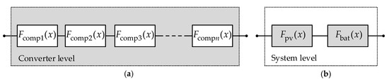 Series connection of the reliability block diagram: (a) converter level and (b) system level, where represents the unreliability function of the device in the converter, and and represent the unreliability functions of the PV and battery converters, respectively.